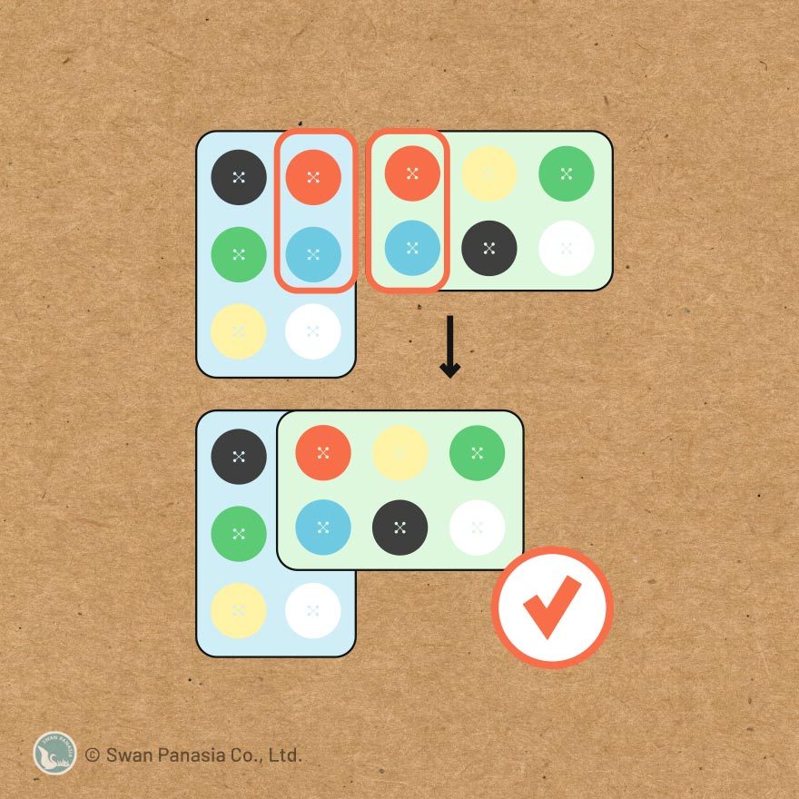 每個人都有一副鈕釦牌,誰能用最短的時間,將手上的鈕釦依照桌面上相同的顏色「扣」完,就可獲得勝利。很刺激喔!